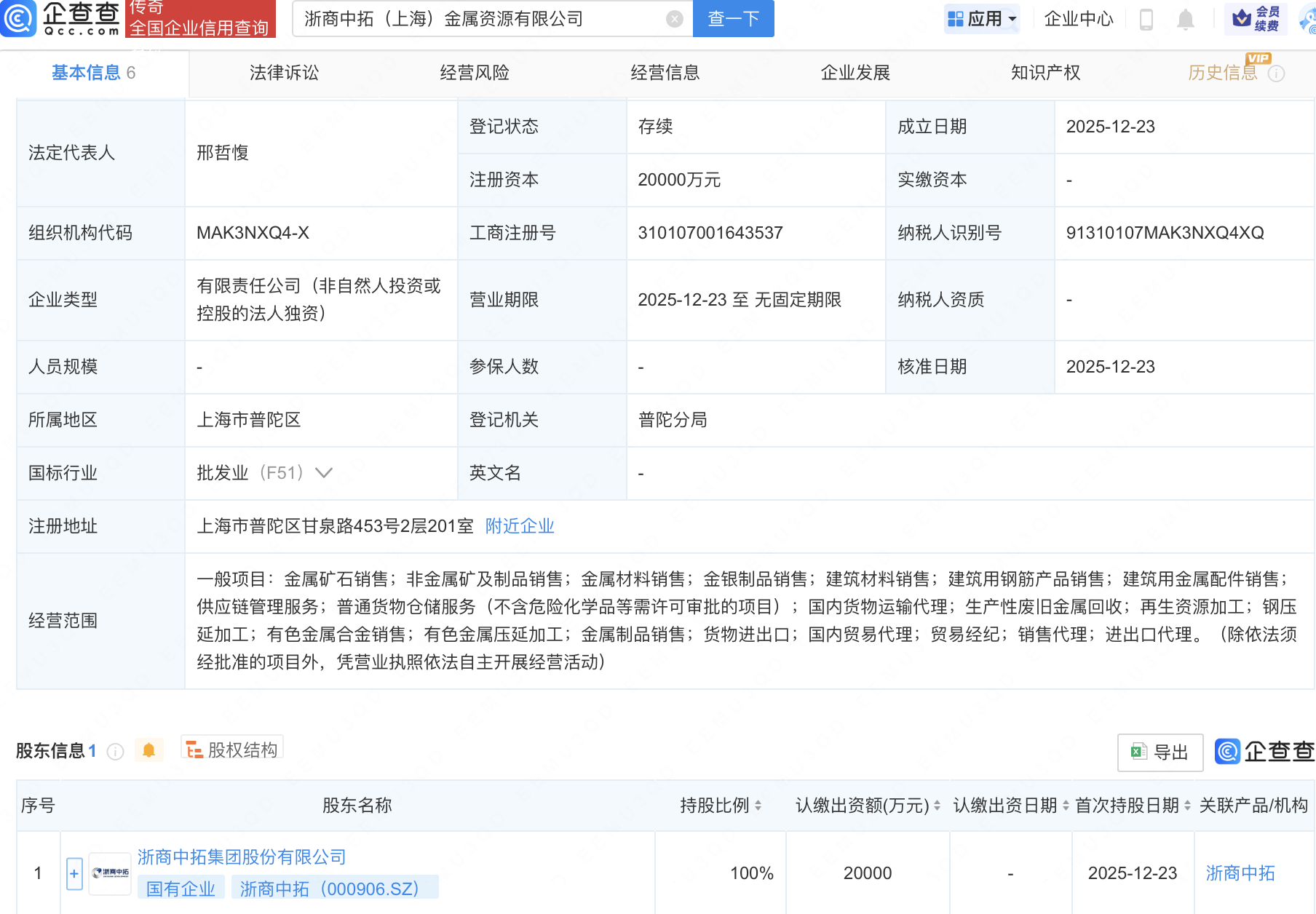 近日,浙商中拓(上海)金属资源有限公司成立,注册资本2亿元乾鑫配资,经营范围包含:金属矿石销售;非金属矿及制品销售;金属材料销售;金银制品销售等。企查查股权穿透显示,该公司由浙商中拓(000906)全资持股。