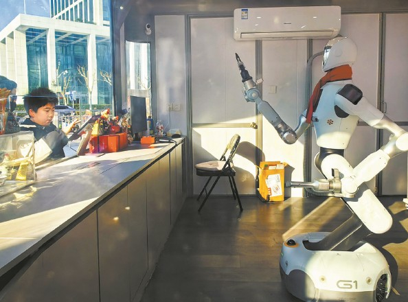 图说:在上海街头的“银河太空舱”,机器人小Gal在为小顾客服务 杨建正 摄