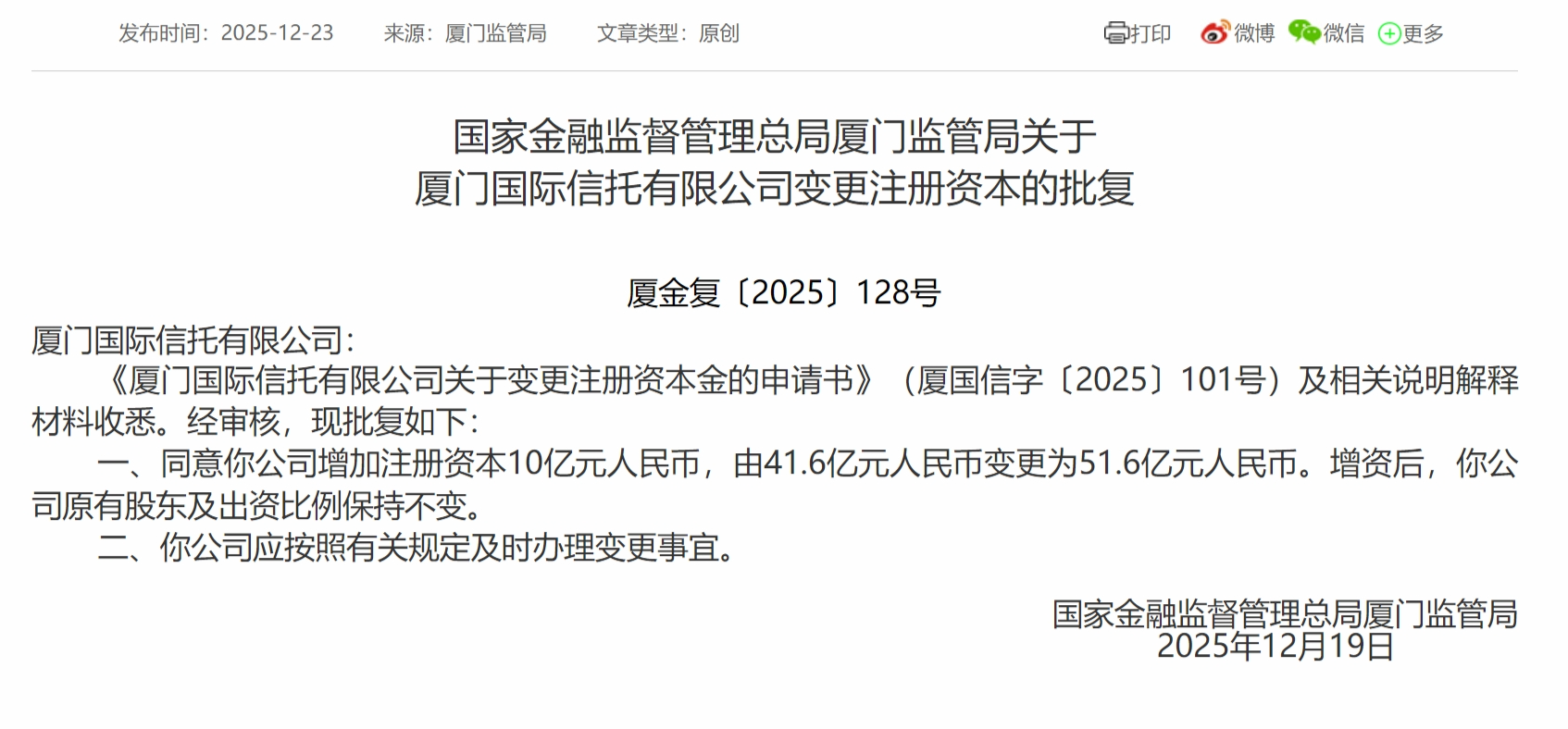 12月23日,国家金融监督管理总局厦门监管局发布关于厦门国际信托有限公司变更注册资本的批复,同意该公司增加注册资本10亿元人民币,由41.6亿元人民币变更为51.6亿元人民币。增资后股壹佰,该公司原有股东及出资比例保持不变。