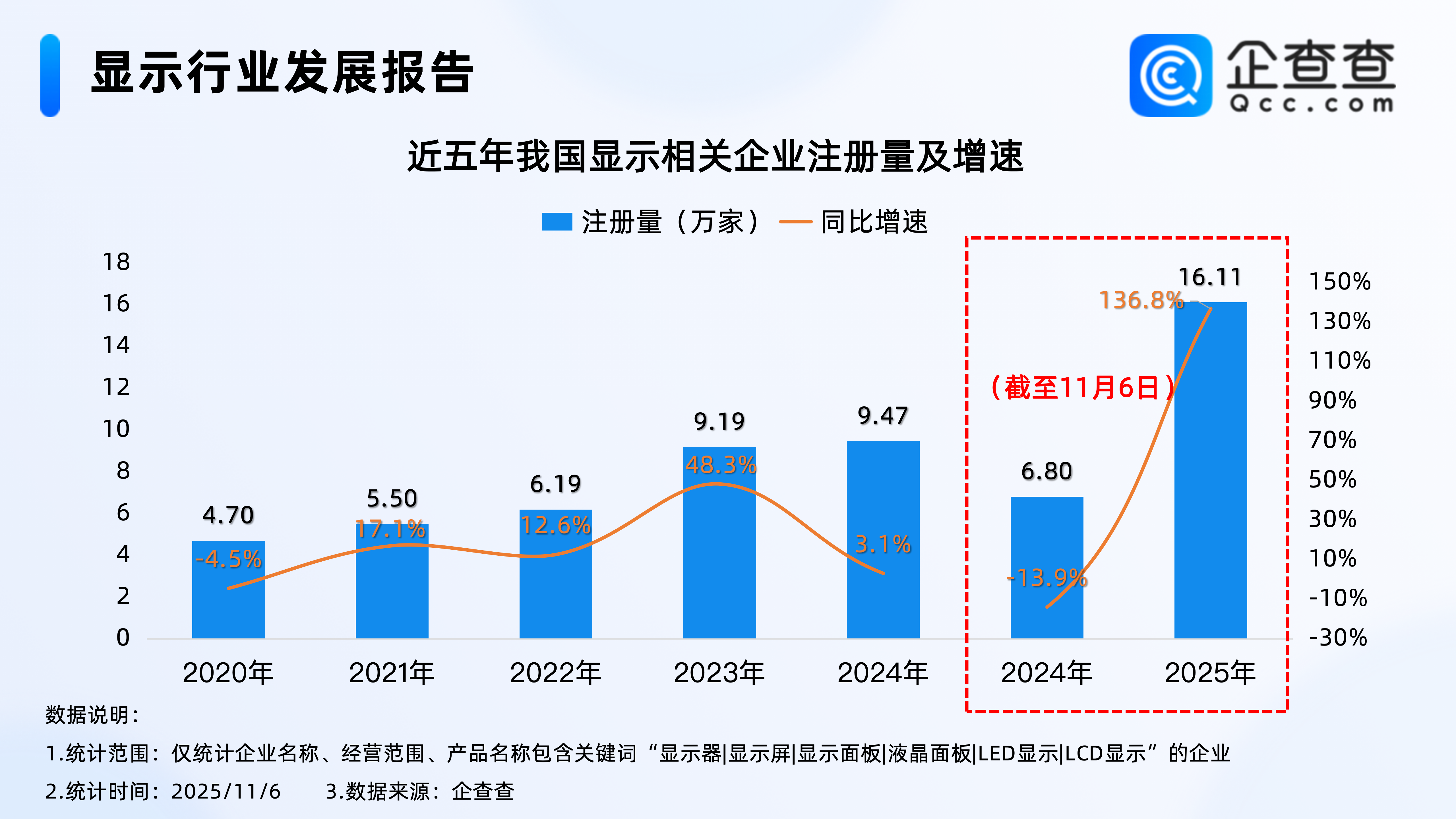 据媒体报道,最新数据显示,我国显示面板、显示材料全球市场占有率均稳居全球第一,产值规模已占全球一半。新型显示是承载影像信息的关键载体和人机交互的重要界面,被誉为数字经济的“眼睛”、人工智能的“窗口”。研究显示,我国显示产业已驶入“AI+显示”发展快车道。中国光学光电子行业协会胡春明表示:“预计2025年,我国新型显示行业的产值规模将超过1100亿美元,接近8000亿元人民币。”企查查数据显示淘优配淘优配,今年以来我国显示相关企业注册量激增。截至11月6日淘优配,2025年我国已注册16.11万家显示相关企业,相比2024年同期增加136.8%;今年新注册的相关企业主要分布在华中地区,占比超五成;伴随注册量规模的稳步提升,截至11月6日,我国现存62.2万家显示相关企业。1.从注册量来看:今年注册量同比激增136.8%