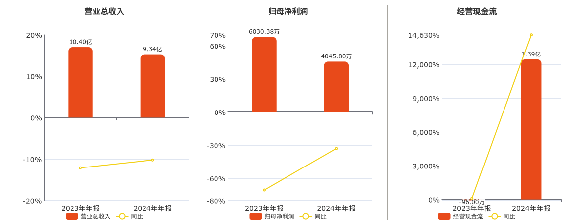 公司营业总收入为9.34亿元,在已披露的同业公司中排名第101,较去年同报告期营业总收入减少1.06亿元,同比较去年同期下降10.22%。归母净利润为4045.80万元,在已披露的同业公司中排名第106,较去年同报告期归母净利润减少1984.59万元,同比较去年同期下降32.91%。经营活动现金净流入为1.39亿元。